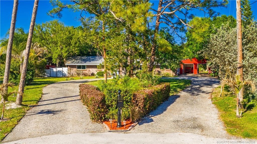 S-P-R-E-A-D out in this roomy Ranch on a .558 acre high & dry cul-de-sac lot tucked off the main roadway making its location in ever popular North River Shores exceptionally private. The sturdy brick home sits near the middle of the property surrounded by mature trees and Olde Florida charm.The horseshoe shaped circular drive is made up of recycled asphalt, a green product that is environmentally friendly. A detached 2-car garage with 3 bay doors is ideal! There are two additional sheds for lawn...S-P-R-E-A-D out in this roomy Ranch on a .558 acre high & dry cul-de-sac lot tucked off the main roadway making its location in ever popular North River Shores exceptionally private. The sturdy brick home sits near the middle of the property surrounded by mature trees and Olde Florida charm.The horseshoe shaped circular drive is made up of recycled asphalt, a green product that is environmentally friendly. A detached 2-car garage with 3 bay doors is ideal! There are two additional sheds for lawn equipment and a well house for irrigation. IMPACT WINDOWS add energy efficiency. The renovated interior is light and bright with many extras. A bedroom suite and two more bedrooms and bath are behind the kitchen. The other two bedrooms, both with step-in closets and mini-splits, are prime WFH spots off the living area. A chef inspired kitchen and pantry. An attractive faux fireplace. French doors opening to the restful screened porch and a back yard filled with potential.